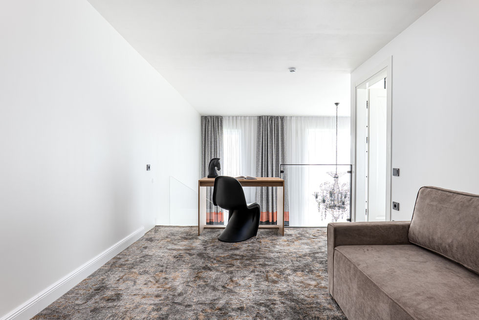 Viršutiniame aukšte įsikūrę apartamentai pasižymi itin aukštomis lubomis, dideliais langais, erdviu kambarių suplanavimu. Namus kūrė profesionali dizainerė, tad stilingo dizaino namai nustebins spalvų derme, raštų pasirinkimu ir jaukumu. Pirmame aukšte įrengta svetainės, valgomojo ir virtuvės dalis su išėjimu į terasą, vonios kambarys. Antrame – 2 miegamieji.